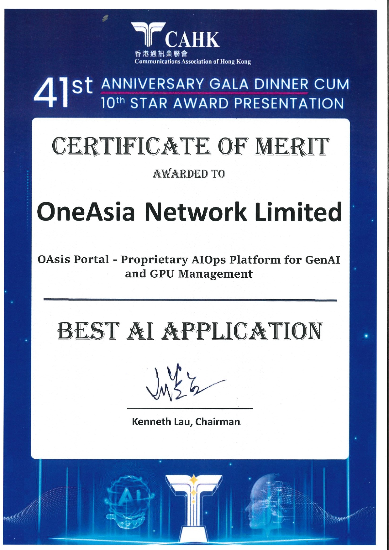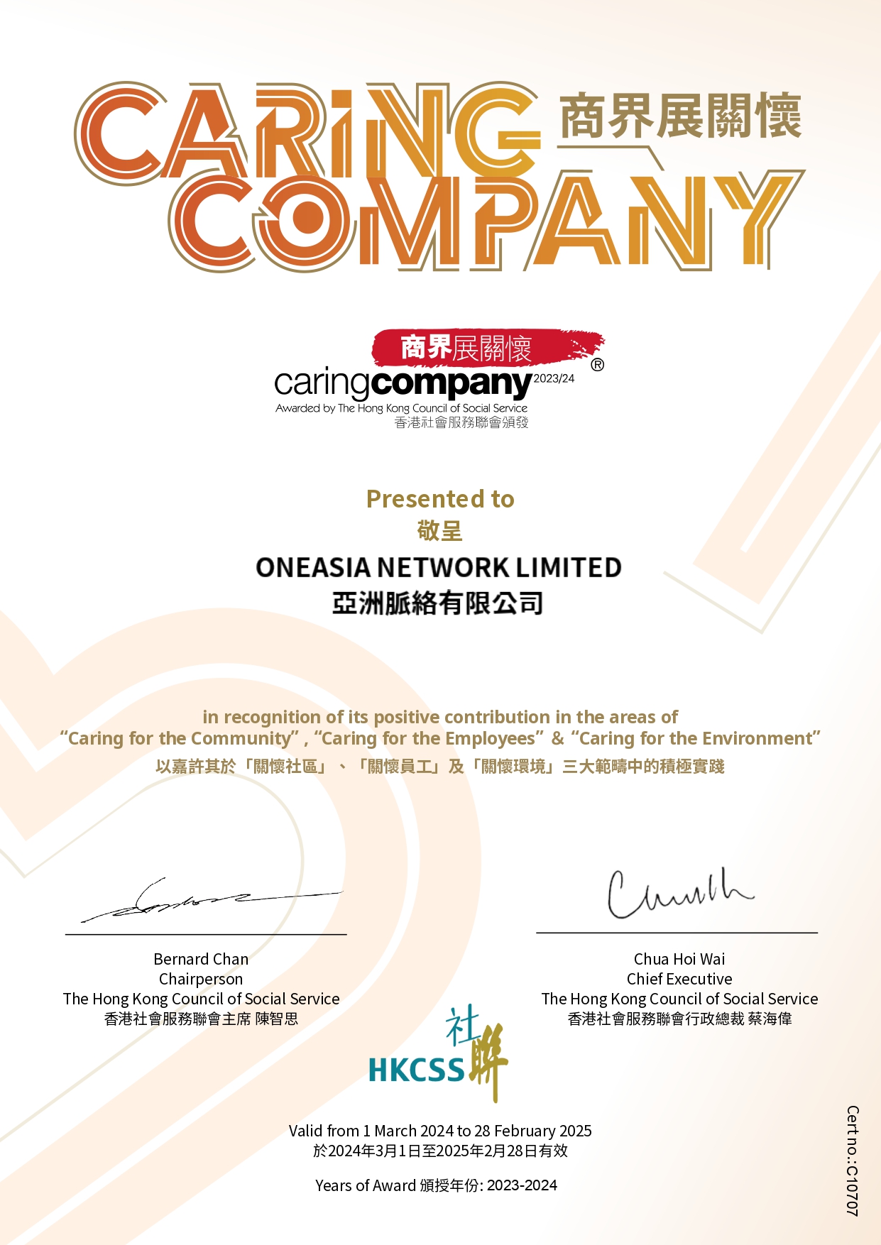 In recognition of OneAsia’s positive contribution in the areas of “Caring for the Community” , “Caring for the Employees” & “Caring for the Environment”